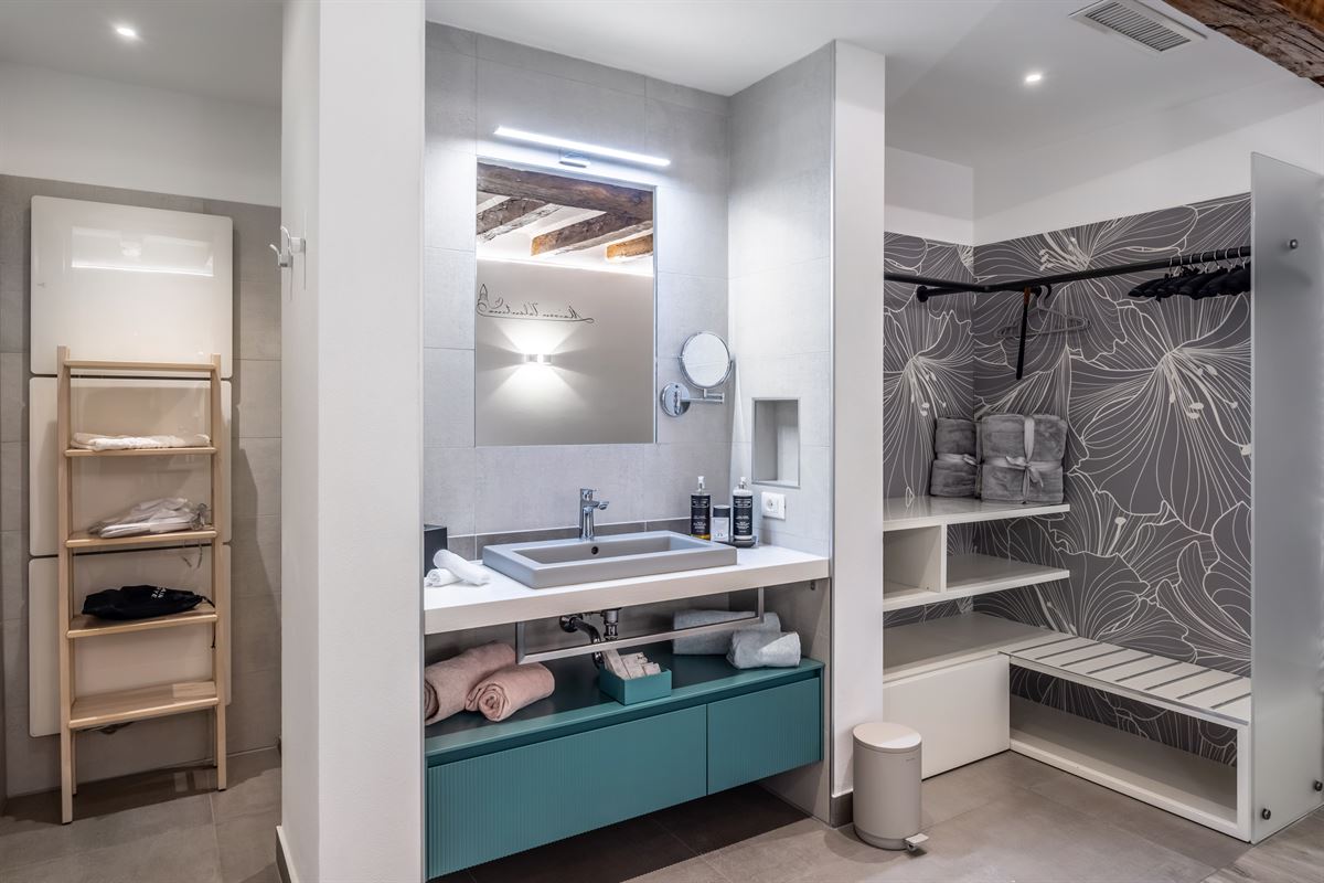 La seconda è rappresentata da un accenno di design nell’installazione del lavandino a vista in camera, mirato a valorizzare al massimo ogni richiamo al passato, come la spaziosa doccia ricavata dalla nicchia originale.