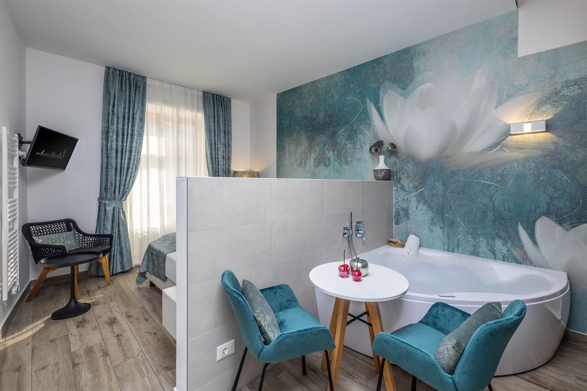 Al piano di entrata, è disposta una lussuosa vasca idromassaggio con sali da bagno inclusi, accanto ad un confortevole letto matrimoniale king size (180 x 200 cm).
